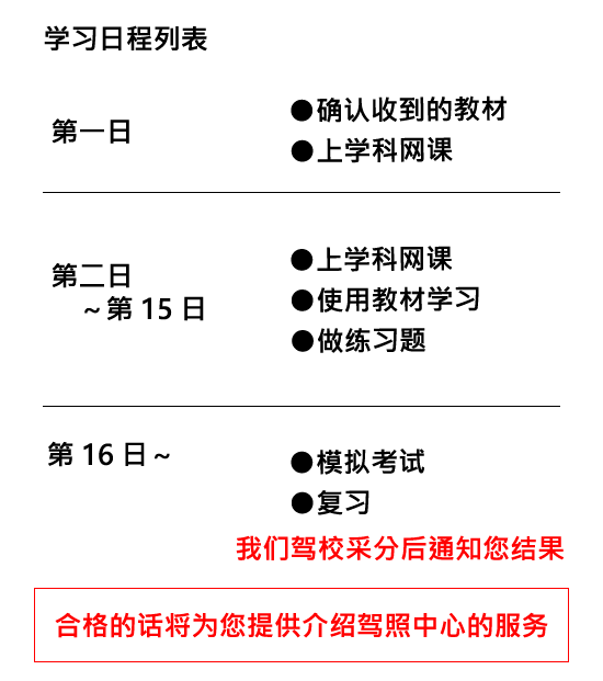 入校后AT车的课程最短是15日(在通常日程的基础上+1日)。由本驾校的担当人员送您去新泻县驾照中心进行学科笔试考试。