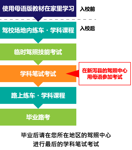 入校之后,您需要在新泻县驾照中心,进行母语版的临时驾驶驾照笔试考试。由于是用母语进行笔试考试,因此您可以顺利地进行路上的练车课程。