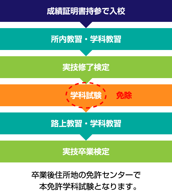 「成績証明書」を持参して通常の合宿プランでご入校いただきます。最難関の仮免許学科試験が免除となりスムーズに路上教習に進むことができます。