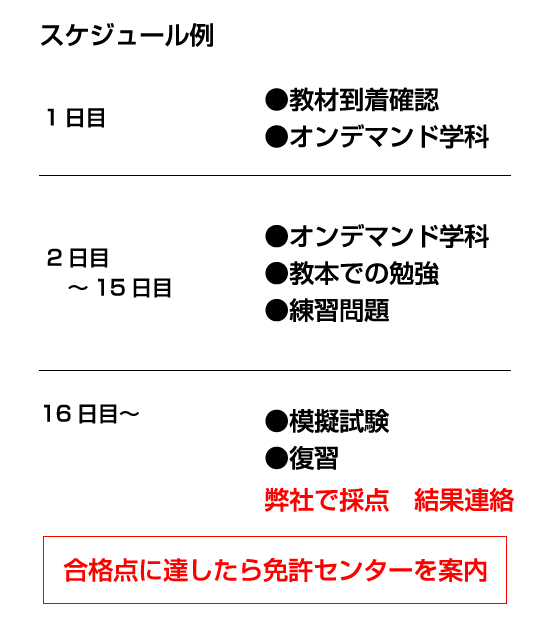母国語の学科教本・問題集・オンデマンド学科教材を提供させていただき、自宅学習をしていただきます。