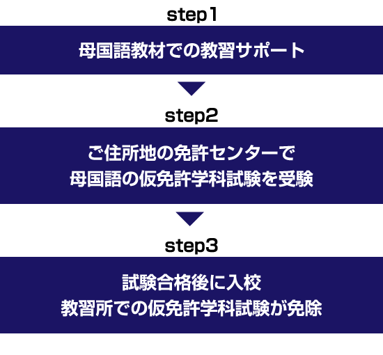ご入校前に母国語の学科教本・問題集・オンデマンド学科教材を提供させていただき、自宅学習をしていただきます。