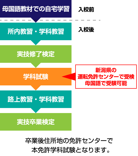 ご入校後の仮免許学科試験は新潟県運転免許センターにて母国語の試験を受験していただきます。母国語での試験ですので、スムーズに路上教習に進むことができます。